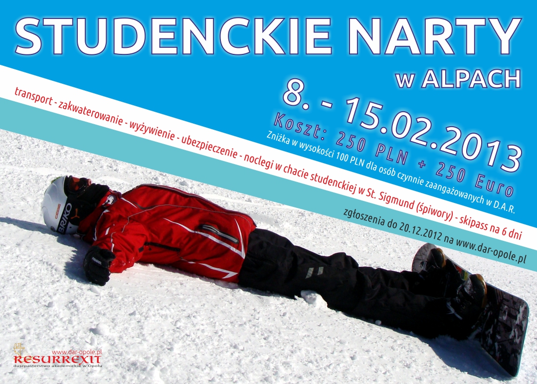 8. - 15. 02.2013r. - ten tydzień warto sobie zarezerwować! Politechnika ma wtedy ferie, a Uniwersytet będzie już po sesji. Duszpasterstwo Akademickie Resurrexit zaprasza po raz kolejny na formacyjny obóz narciarski. Gdzie? Chata w St. Sigmunt in Sellrain w Tyrolu. Za...