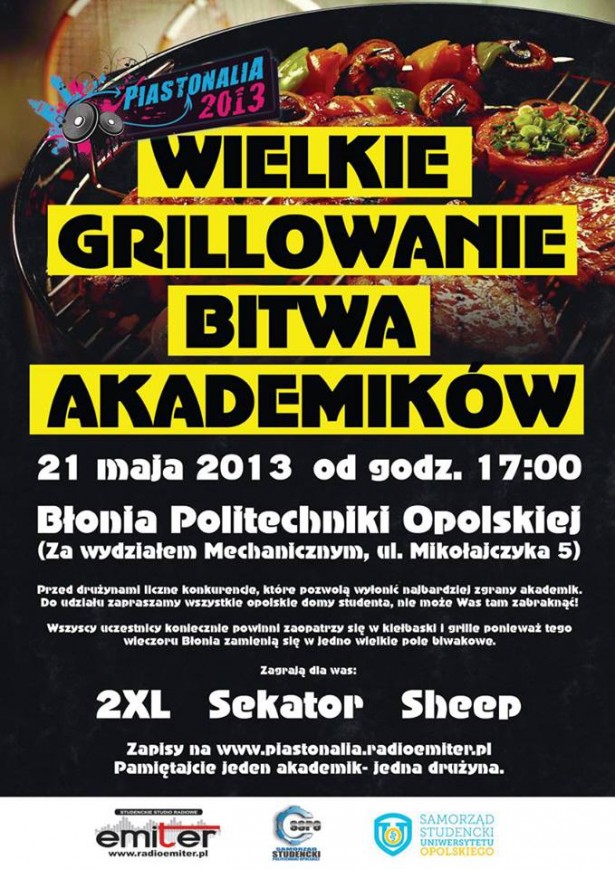 Grillowanie z okazji Piastonaliów! Miłośnicy pieczonej kiełbaski łączcie się! Wielkie grillowanie po raz kolejny tej wiosny, tym razem na Błoniach Politechniki Opolskiej. Zaproszeni są wszyscy studenci, absolwenci oraz sympatycy grillowanych produktów. Przyjść może...